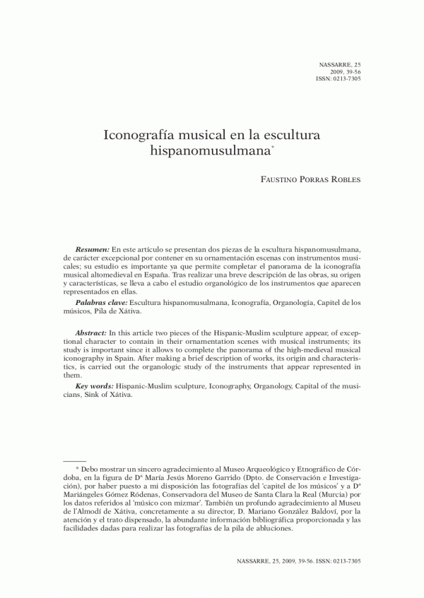Iconografía musical en la escultura hispanomusulmana. Faustino Porras Robles [Recurso electrónico]