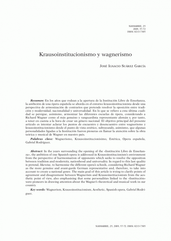 RESUMEN: En los años que rodean a la apertura de la Institución Libre de Enseñanza, la ambición de una ópera española se aborda en el entorno krausoinstitucionista desde una perspectiva de armonización de contrarios que pretende resolver la oposición entre tradición y modernidad, nacionalidad y universalidad. En lo que se refiere a esta última cualidad se persigue, asimismo, armonizar las diferentes escuelas de ópera, considerando a Richard Wagner como el más genuino y vanguardista representante alemán, y por tanto, a tener en cuenta a la hora de crear un género nacional. El objetivo principal del presente artículo es intentar aclarar los puntos de encuentro y desencuentro entre wagnerianismo y krausoinstitucionismo desde el punto de vista estético, subrayando, asimismo, que algunas personalidades ligadas a la Institución fueron pioneras en llamar la atención sobre la obra teórica y musical de Wagner en nuestro país. PALABRAS CLAVE: Wagnerismo. Krausoinstitucionismo, Estética, Ópera española, Gabriel Rodríguez.