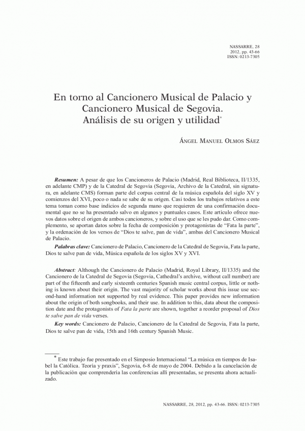 RESUMEN: A pesar de que los Cancioneros de Palacio (Madrid, Real Biblioteca, II/1335, en adelante CMP) y de la Catedral de Segovia (Segovia, Archivo de la Catedral, sin signatura, en adelante CMS) forman parte de un corpus central de la música española del siglo XV y comienzos del XVI, poco o nada se sabe de su origen. Casi todos los trabajos relativos a este tema toman como base indicios de segunda mano que requieren de una confirmación documental que no se ha presentado salvo en algunos y puntuales casos. Este artículo ofrece nuevos datos sobre el origen de ambos cancioneros, y sobre el uso que se les pudo dar. Como complemento, se aportan datos sobre la fecha de composición y protagonistas de "Fata la parte", y la ordenación de los versos de "Dios te salve, pan de vida", ambas del Cancionero Musical de Palacio. PALABRAS CLAVE: Cancionero de Palacio, Cancionero de la Catedral de Segovia, Fata la parte, Dios te salve pan de vida, Música española de los siglos XV y XVI.