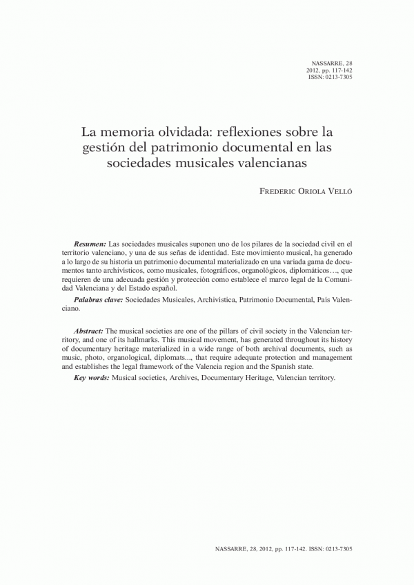 RESUMEN: Las sociedades musicales suponen uno de los pilares de la sociedad civil en el territorio valenciano, y una de sus señas de identidad. Este movimiento musical, ha generado a lo largo de su historia un patrimonio documental materializado en una variada gama de documentos tanto archivísticos, como musicales, fotográficos, organológicos, diplomáticos..., que requieren de una adecuada gestión y protección como establece el marco legal de la Comunidad Valenciana y del Estado español. PALABRAS CLAVE: Sociedades Musicales, Archivística, Patrimonio Documental, País Valenciano.