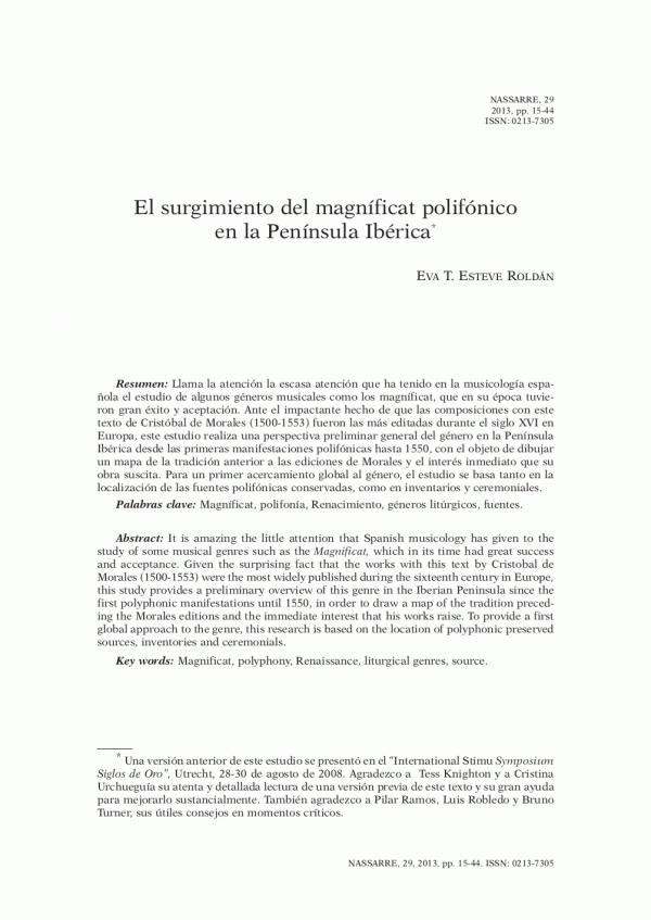 RESUMEN: En la musicología española no se ha prestado demasiada atención a algunos géneros musicales como los magnificat, que en su época tuvieron gran éxito y aceptación. Ante el hecho de que las composiciones con este texto de Cristóbal de Morales (1500-1553) fueron las más editadas durante el siglo XVI en Europa, este estudio realiza una perspectiva preliminar general del género en la Península Ibérica desde las primeras manifestaciones polifónicas hasta 1550, con el objeto de dibujar un mapa de la tradición anterior a las ediciones de Morales y el interés inmediato que su obra suscita. Para un primer acercamiento global al género, el estudio se basa en la localización de las fuentes polifónicas conservadas, en inventarios y ceremoniales. PALABRAS CLAVE: Magnificat, polifonía, Renacimiento, géneros litúrgicos, fuentes.