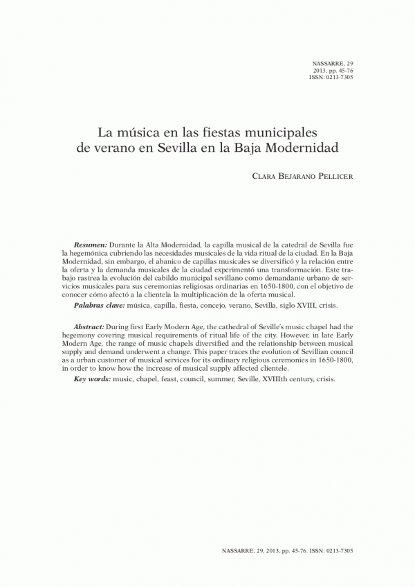 RESUMEN: Durante la Alta Modernidad, la capilla musical de la catedral de Sevilla fue la hegemónica cubriendo las necesidades musicales de la vida ritual de la ciudad. En la Baja Modernidad, sin embargo, el abanico de capillas musicales se diversificó y la relación entre la oferta y la demanda musical la ciudad experimentó una transformación. Este trabajo rastrea la evolución del cabildo municipal sevillano como demandante urbano de servicios musicales para sus ceremonias religiosas ordinarias entre 1650-1800, con el objetivo de conocer cómo afectó a la clientela la multiplicación de la oferta musical. PALABRAS CLAVE: música, capilla, fiesta, concejo, verano, Sevilla, siglo XVIII, crisis.