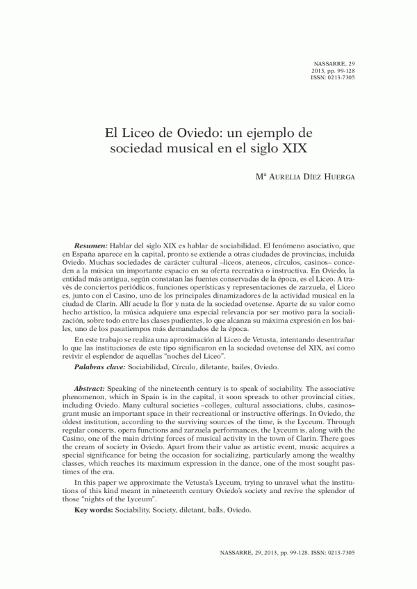 RESUMEN: Hablar del siglo XIX es hablar de sociabilidad. El fenómeno asociativo, que en España aparece en Madrid, pronto se extiende a otras ciudades de provincias, incluida Oviedo. Muchas sociedades de carácter cultural -liceos, ateneos, círculos, casinos- conceden a los música un importante espacio en su oferta recreativa o instructiva. En Oviedo, la entidad más antigua, según constatan las fuentes conservadas de la época, es el Liceo. A través de conciertos periódicos, funciones operísticas y representaciones de zarzuela, el Liceo es, junto con el Casino, uno de los principales dinamizadores de la actividad musical en la ciudad de Clarín. Allí acude la flor y nata de la sociedad ovetense. Aparte de su valor como hecho artístico, la música adquiere una especial relevancia por ser motivo para la socialización, sobre todo entre las clases pudientes, lo que alcanza su máxima expresión en los bailes, uno de los pasatiempos más demandados de la época. En este trabajo se realiza una aproximación al Liceo de Vetusta, intentando desentrañar lo que las instituciones de este tipo significaron en la sociedad ovetense del XIX, así como revivir el esplendor de aquellas "noches del Liceo". PALABRAS CLAVE: Sociabilidad, Círculo, diletante, bailes, Oviedo.