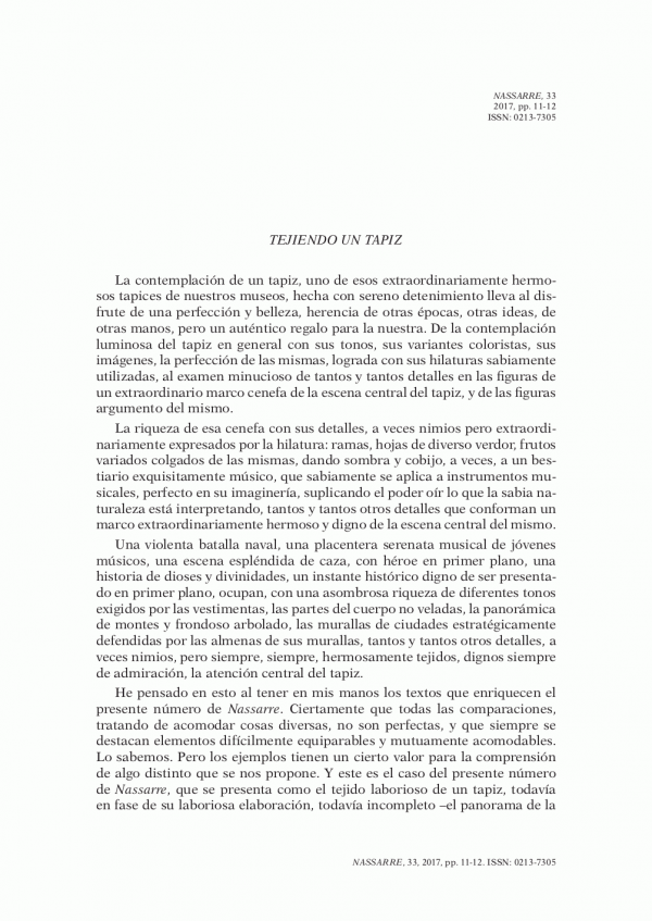 Introducción al volumen n. 33 de la Revista Nassarre, recopilando los diferentes temas que se tratan en las secciones de la revista. El presente número de Nassarre, que se presenta como el tejido laborioso de un tapiz, todavía en fase de su laboriosa elaboración, todavía incompleto -el panorama de la Música es inconmensurable-, buscando número a número de la revista una comprensión complementaria de temas músicos y musicológicos, aproximándonos a ese piélago inmenso e intenso del hecho musical.