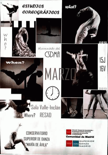 Gala de danza 2019 Videograbación Conservatorio Superior de Danza María de Ávila (CSDMA); dirección, Eva López Crevillén 1. Acatacat/ coreografia, Rossella Russolo. 2. Loca/ coreografía, María Prieto. 3. Todos los fuegos el fuego/ Júlia Estalella. 4. Ser/ coreografía, Lucía Marcos. 5. Martes/ coreografía, Margarita Reyna. 6. Fetiche/ coreografía, Sergio R. Suárez. 7. Eramos tres/ coreografía, Julia María González, Mariona Jaume. 8. Segunda tópica/ coreografía, Lucía Nicolás. 9. Parece que va a llover/ coreografía: Daniel Cabezuelo, Júlia Estalella, Coral Martínez. 10. Lun-Ar/ coreografía: Mauricio Pérez Fayos. 11. Made in Tokio: coreografía, Marta Nogal.