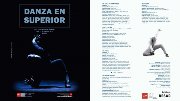 La Rosa de Gerineldo/ coreografía, Guadalupe Torres; música original, Kike Terrón; música popular: Sabicas y Romances; profesora tutora: Fuensanta Ros. -- Empty.After/ coreografía, Ole Kristian Tangen & Jesús Benzal, versión revisada para el CSDMA: Jesús Benzal; música: varios autores; profesor tutor: Héctor Torres. -- La Folía/ coreografía y vestuario: José Maldonado; música, Antonio Vivaldi; profesora tutora: Elvira Andrés. -- Dulce Memoria/ coreografía, Ángel Rodríguez, música, Martin Codax, Diego Ortiz, Tomás Luis de Victoria; profesoras tutoras: Marina Jiménez, Eva López Crevillén. -- Preludio/ coreografía y vestuario, Mario Bermúdez Gil; asistente de coreografia. Violeta Wulff Mena; música, Ludovico Einaudi; Esther Kokmeijer & Rutger Zuydervelt; profesora tutora, Anuska Alonso.