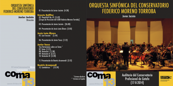 Reparto: Javier Jacinto, directorReparto: Orquesta Sinfónica del Conservatorio Moreno TorrobaCompositores: Ernesto Halffter, Jesús León Álvaro, Javier Tausz, Beatriz Arzamendi