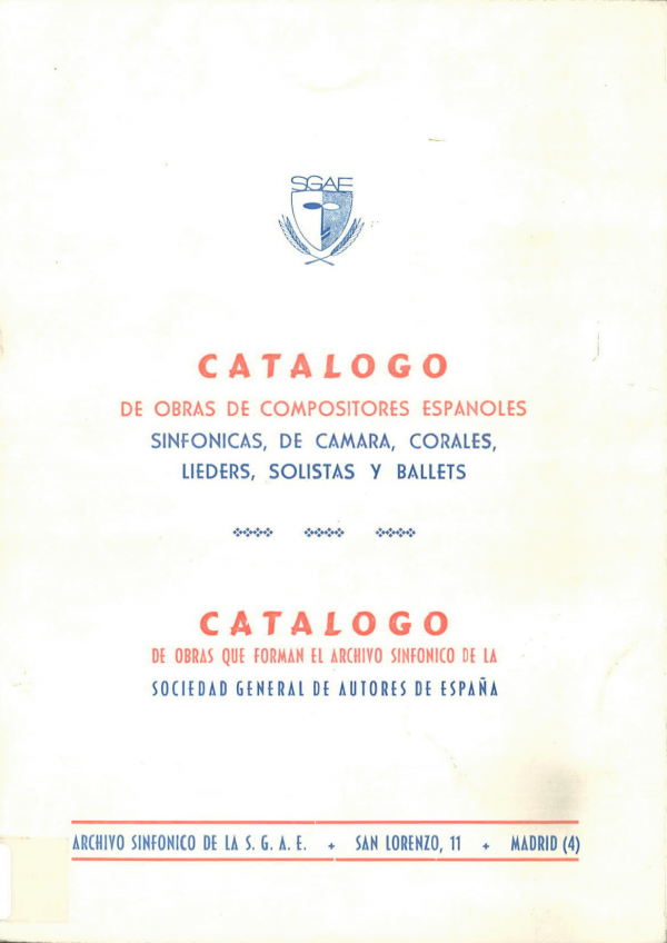 Catálogo de obras de compositores españoles sinfónicas, de cámara, corales, lieders, solistas y ballets y Catálogo de obras que forman el Archivo Sinfónico de la Sociedad General de Autores de España Sociedad General de Autores de España [Texto impreso]