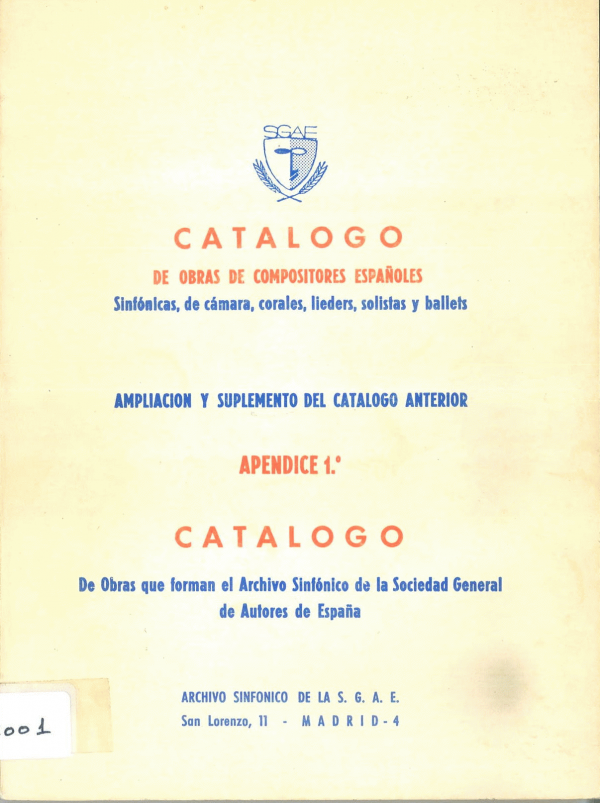 Catálogo de obras de compositores españoles sinfónicas, de cámara, corales, lieders, solistas y ballets y Catálogo de obras que forman el Archivo Sinfónico de la Sociedad General de Autores de España: apéndice 1º Sociedad General de Autores de España [Texto impreso]
